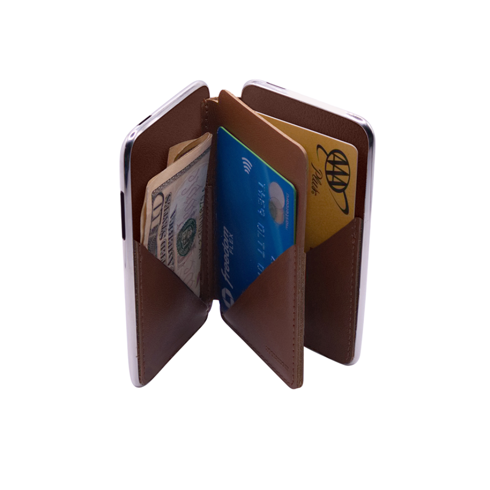 Tri-Fold wallet, with high quality embossed leather interior. Carries up to four cards and folded cash. Magnetic latch keeps wallet fully closed for easier handling.