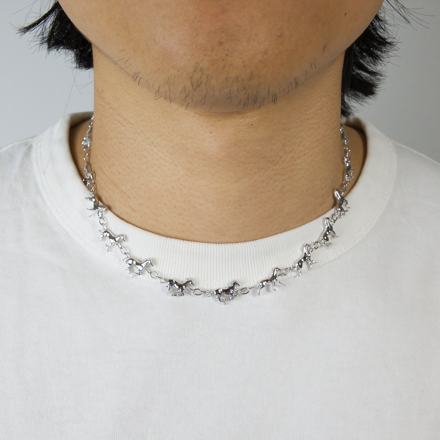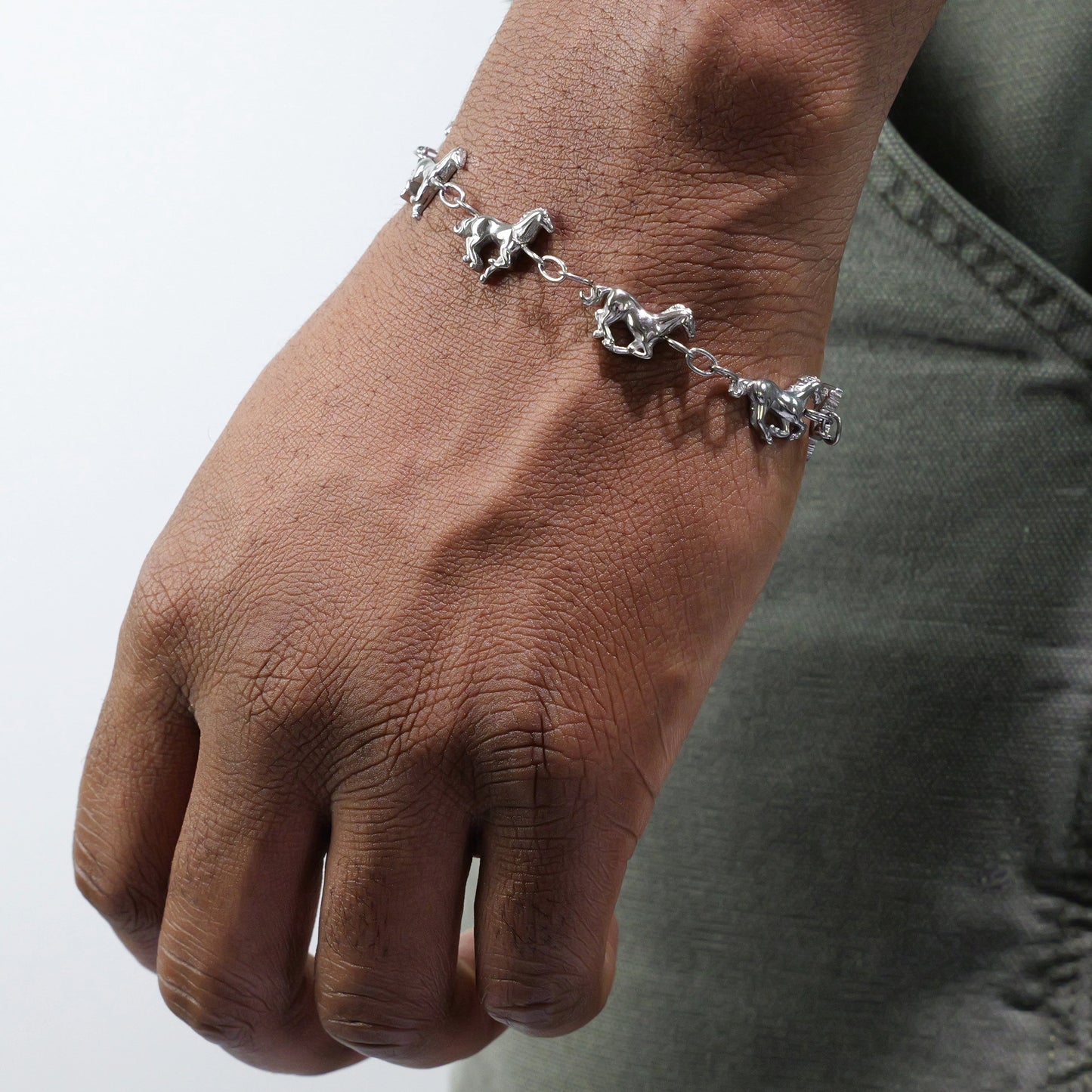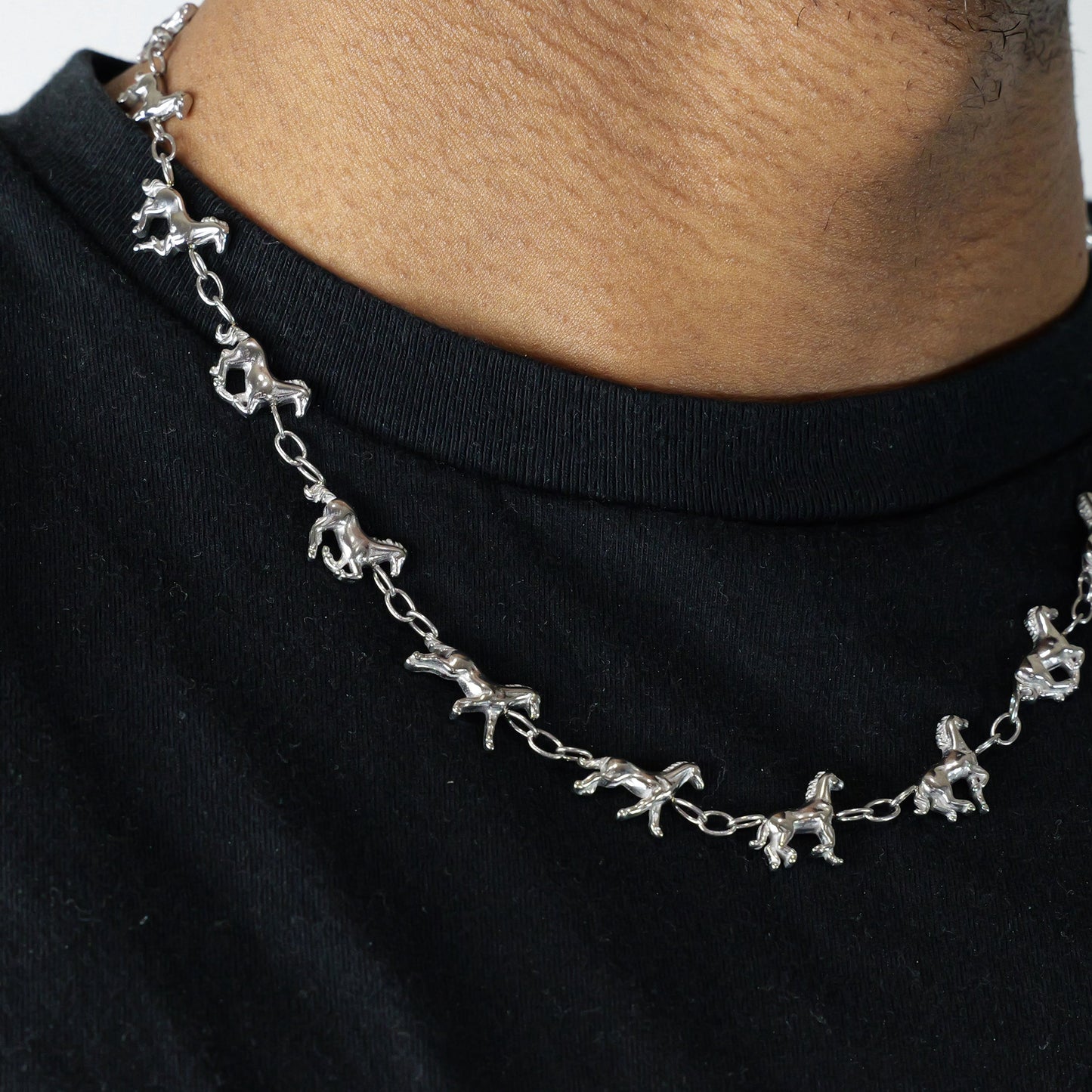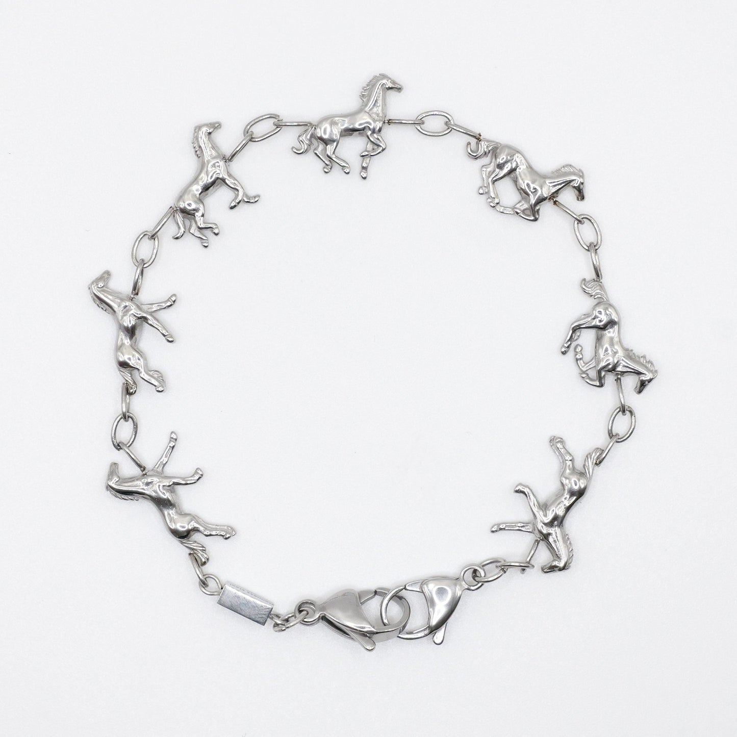 Necklace and/or Bracelet comprised of a repeating array of six detailed links that each capture the sequential stages of a horse in full stride. Made of Tarnish resistant Stainless Steel, and each link has a flat back. Bracelet comes with double jumbo clasps for easy wearing and removal.