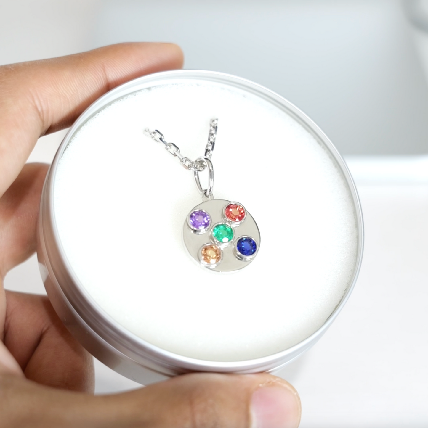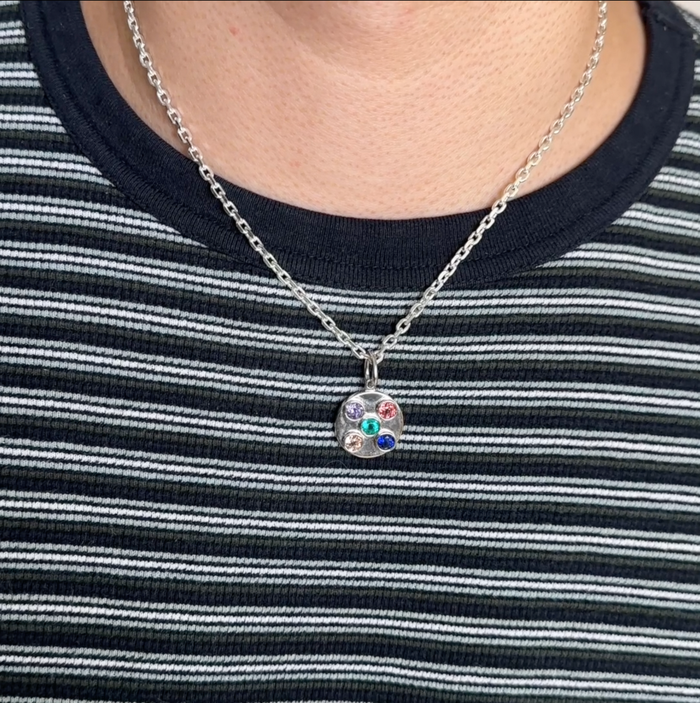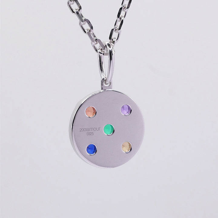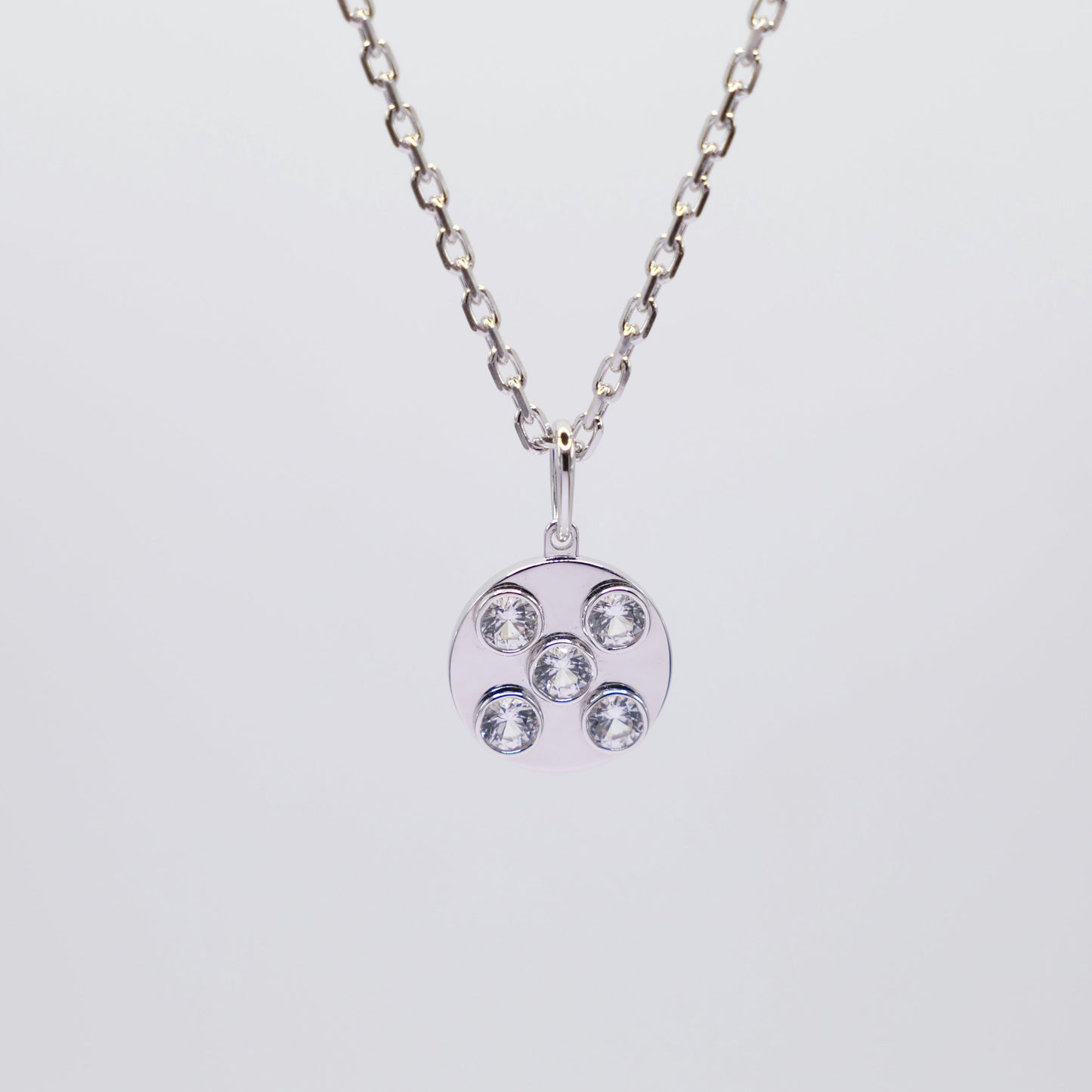 Five, 5mm lab grown sapphires assorted within a penny sized circular pendant, accompanied by a 3x4mm diamond cut cable chain. both the pendant and chain are made of 92.5 sterling silver, finished with a rhodium coating to prevent tarnishing over time.