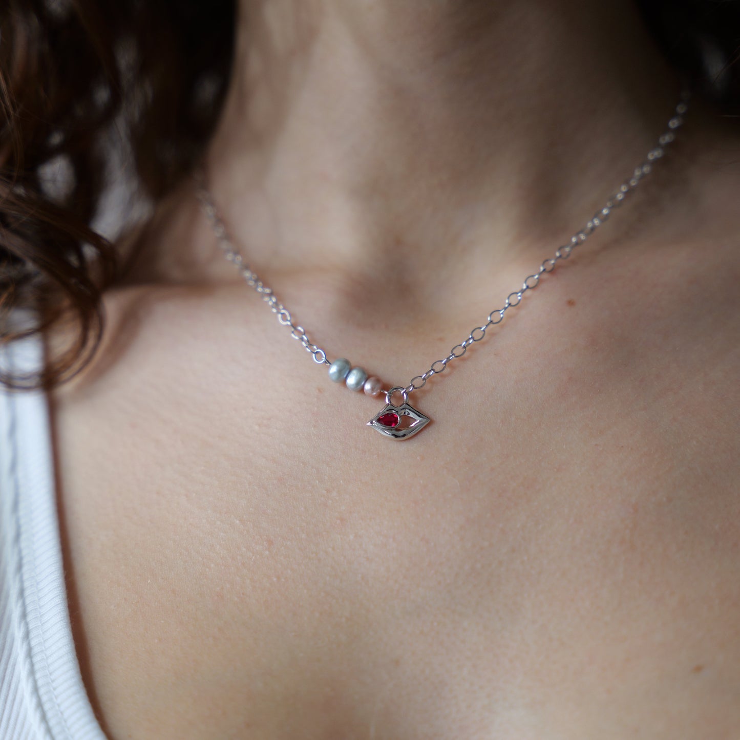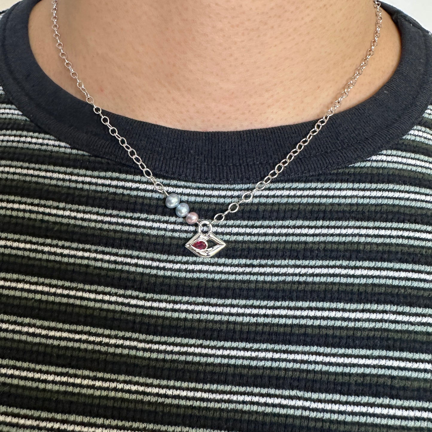 Designed in-house, 92.5 Sterling Silver cable chain and pendant, with a lab-grown 3x5mm Pigeon Blood Ruby set inside. With blue and pink Genuine Freshwater Pearls, The Uma Necklace extracts the primary colors within a scene from the popular Tarantino film, Pulp Fiction.